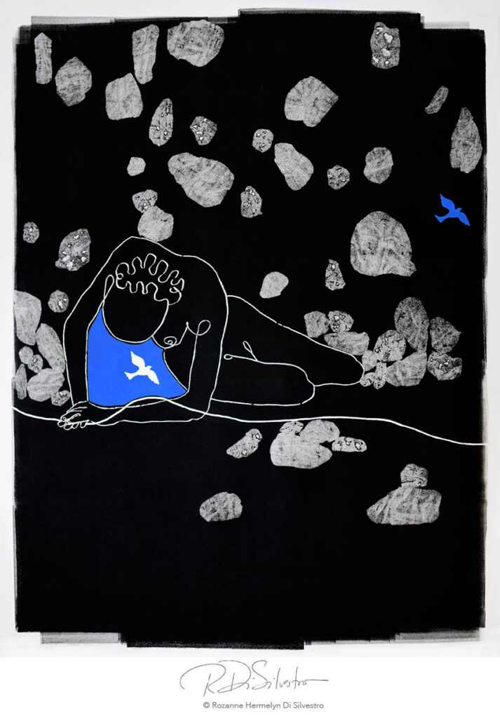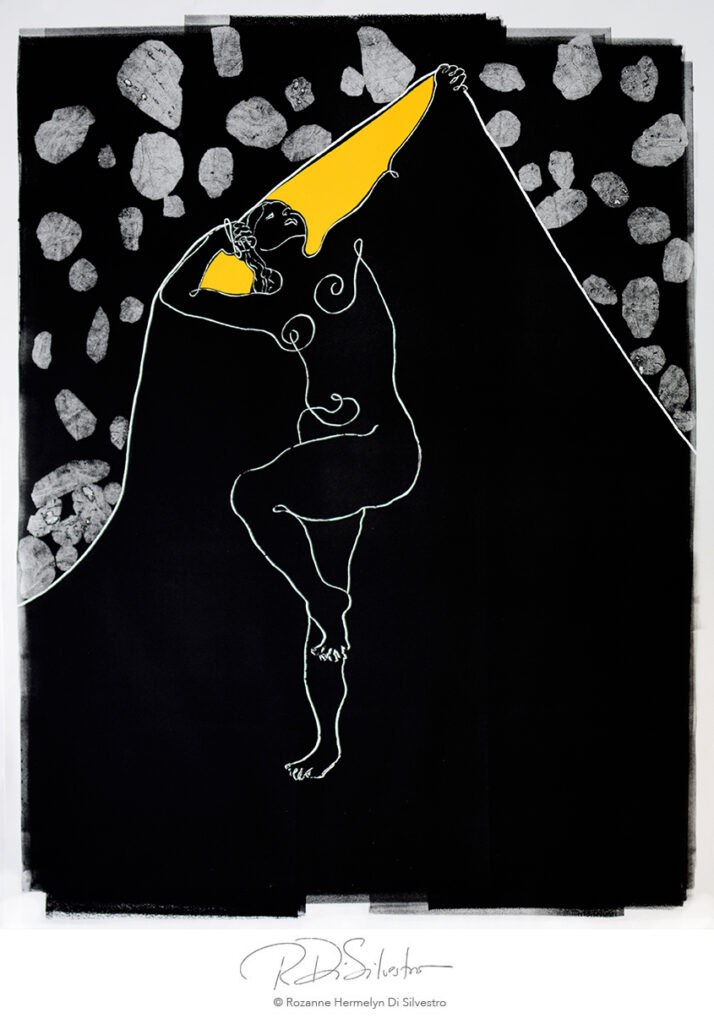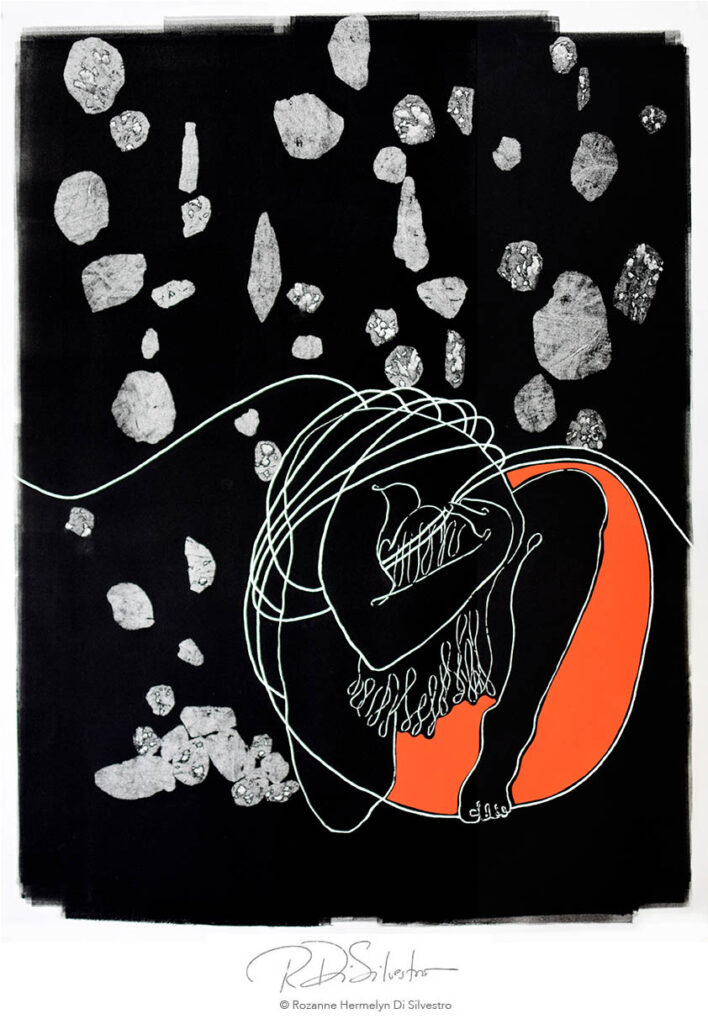 Monotype, oil ink, and fabric rocks chine collé
